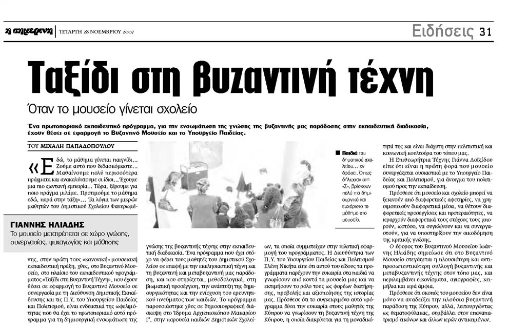 "Εδώ, το μάθημα γίνεται παιγνίδι. Ζούμε αυτό που διδασκόμαστε… Μαθαίνουμε πολύ περισσότερα πράγματα και ανακαλύπτουμε οι ίδιοι… Έχουμε μια πιο ζωντανή εμπειρία… Τώρα, ξέρουμε για ποιο πράγμα μιλάμε. Προτιμούμε το μάθημα εδώ, παρά στην τάξη"... Τα λόγια των μικρών μαθητών του Δημοτικού Σχολείου Φανερωμένης, στην πρώτη τους "κανονική" μουσειακή εκπαιδευτική πράξη, χθες, στο Βυζαντινό Μουσείο, στο πλαίσιο του εκπαιδευτικού προγράμματος "Ταξίδι στη Βυζαντινή Τέχνη", που έχουν θέσει σε εφαρμογή το Βυζαντινό Μουσείο σε συνεργασία με τη Διεύθυνση Δημοτικής Εκπαίδευσης και τις Π.Υ. του Υπουργείου Παιδείας και Πολιτισμού, είναι ενδεικτικά της ωφελιμότητας που θα έχει το πρωτοποριακό αυτό πρόγραμμα για τη δημιουργική ενσωμάτωση της γνώσης της βυζαντινής τέχνης στην εκπαιδευτική διαδικασία. Ένα πρόγραμμα που έχει στόχο να φέρει τους μαθητές του Δημοτικού Σχολείου σε επαφή με την εκκλησιαστική τέχνη και τη βυζαντινή και μεταβυζαντινή μας παράδοση, και που στηρίζεται, μεθοδολογικά, στη βιωματική προσέγγιση, την ανάπτυξη της δημιουργικότητας και την ενίσχυση του ερευνητικού πνεύματος των παιδιών.
