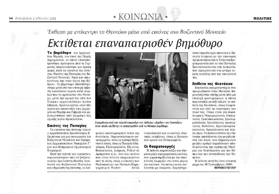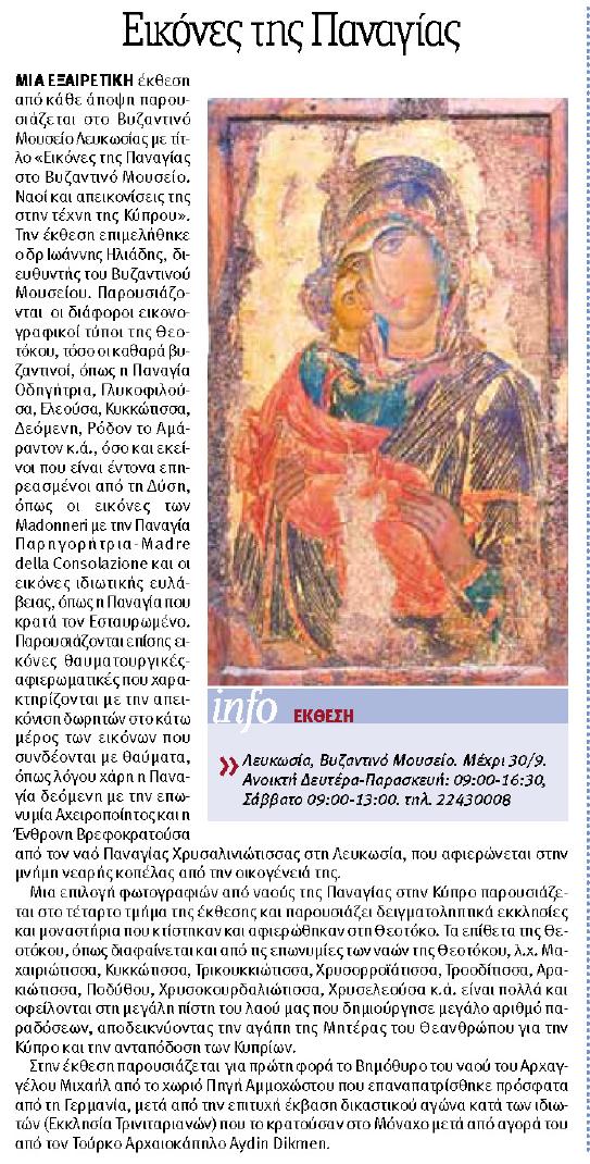 Πραγματοποιήθηκαν το απόγευμα της Τρίτης 31 Μαρτίου 2009 τα εγκαίνια της Έκθεσης «Εικόνες της Παναγίας στο Βυζαντινό Μουσείο Ναοί και απεικονίσεις της στην τέχνη της Κύπρου», στην νέα Αίθουσα Περιοδικών Εκθέσεων του Βυζαντινού Μουσείου του Ιδρύματος Αρχιεπισκόπου Μακαρίου Γ΄ από την Α.Μ Αρχιεπίσκοπο Νέας Ιουστινιανής και Πάσης Κύπρου κ.κ Χρυσόστομο Β΄, παρουσία του Προέδρου του ΚΟΤ, κ. Πάνου Εγγλέζου.