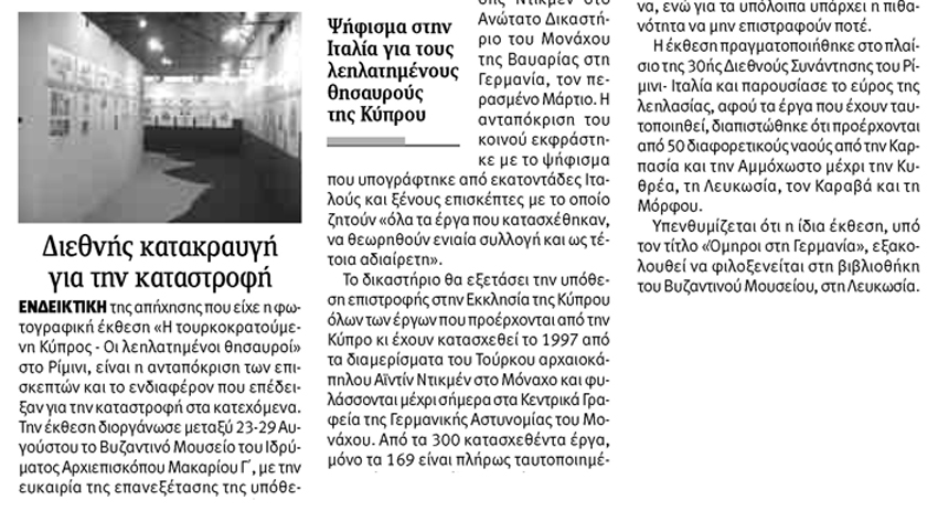 ΕΝΔΕΙΚΤΙΚΗ της απήχησης που είχε η φωτογραφική έκθεση "Η τουρκοκρατούμενη Κύπρος - Οι λεηλατημένοι θησαυροί" στο Ρίμινι, είναι η ανταπόκριση των επισκεπτών και το ενδιαφέρον που επέδειξαν για την καταστροφή στα κατεχόμενα. Την έκθεση διοργάνωσε μεταξύ 23-29 Αυγούστου το Βυζαντινό Μουσείο του Ιδρύματος Αρχιεπισκόπου Μακαρίου Γ΄, με την ευκαιρία της επανεξέτασης της υπόθεσης Ντικμέν στο Ανώτατο Δικαστήριο του Μονάχου της Βαυαρίας στη Γερμανία, τον περασμένο Μάρτιο.