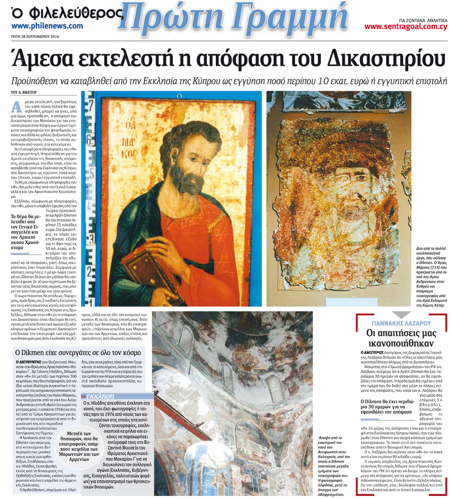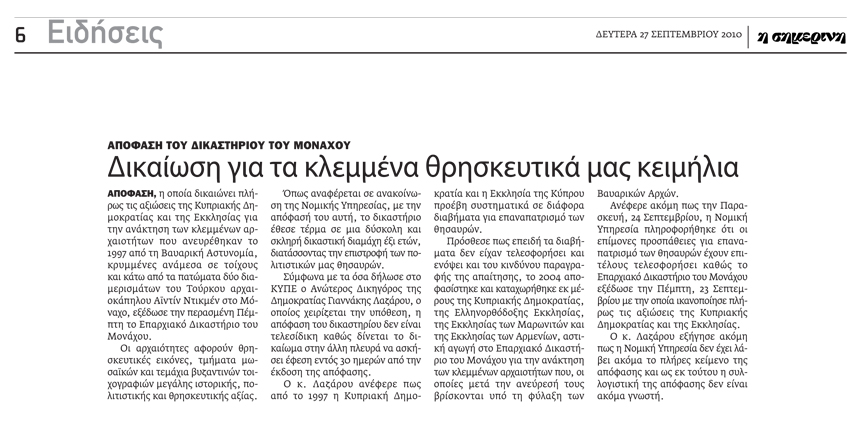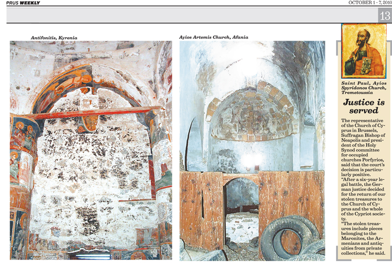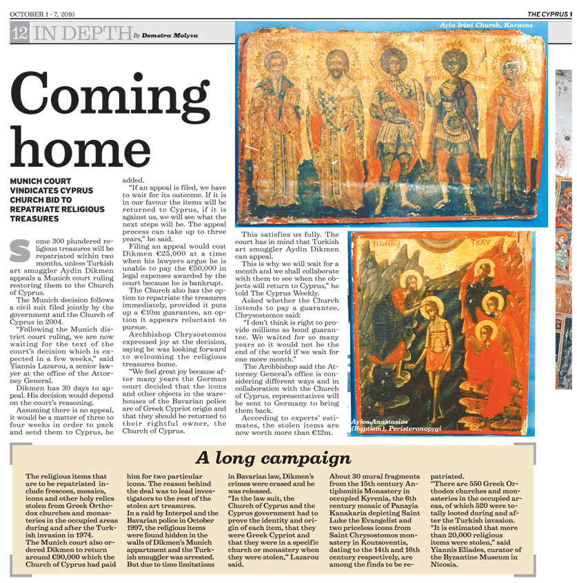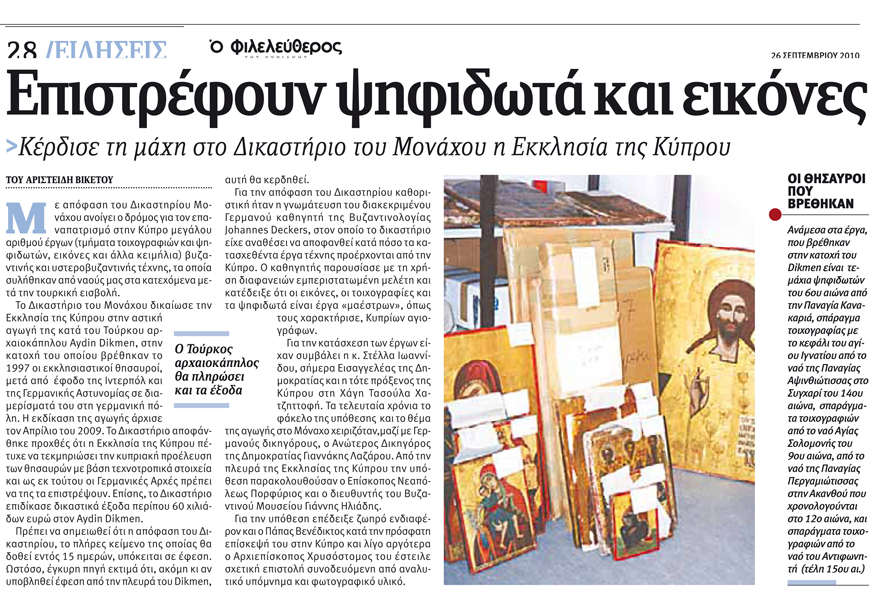 Το Δικαστήριο του Μονάχου δικαίωσε την Εκκλησία της Κύπρου στην αστική αγωγή της κατά του Τούρκου αρχαιοκάπηλου Aydin Dikmen, στην κατοχή του οποίου βρέθηκαν το 1997 οι εκκλησιαστικοί θησαυροί, μετά από έφοδο της Ιντερπόλ και της Γερμανικής Αστυνομίας σε διαμερίσματά του στη γερμανική πόλη. Η εκδίκαση της αγωγής άρχισε τον Απρίλιο του 2009. Το Δικαστήριο αποφάνθηκε προχθές (23.9.010), ότι η Εκκλησία της Κύπρου πέτυχε να τεκμηριώσει την κυπριακή προέλευση των θησαυρών με βάση τεχνοτροπικά στοιχεία και ως εκ τούτου οι Γερμανικές Αρχές πρέπει να της τα επιστρέψουν.