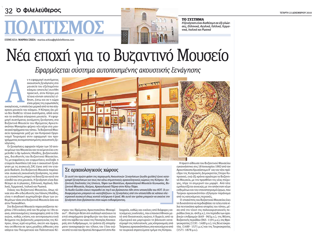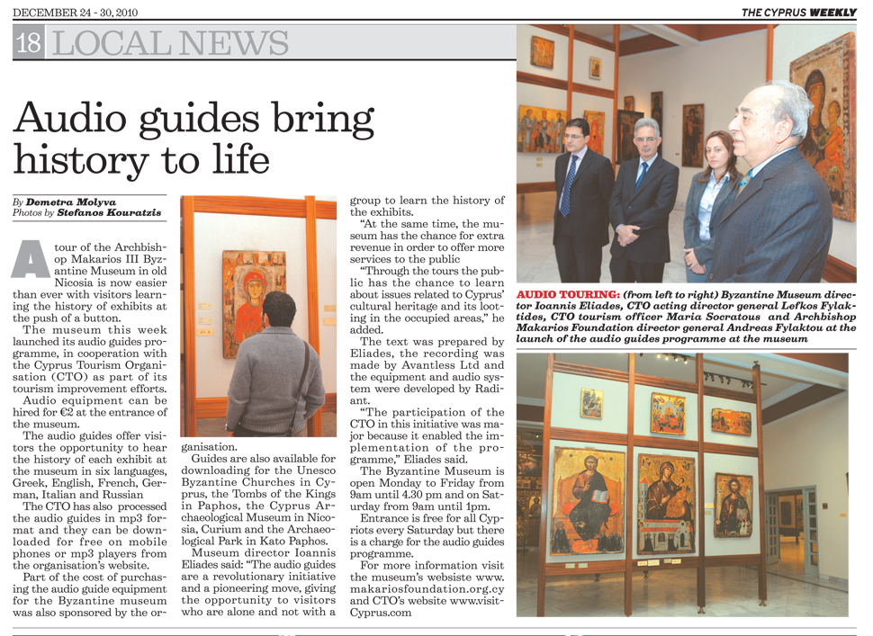 A tour of the Archbishop Makarios III Byzantine Museum in old Nicosia is now easier than ever with visitors learning the history of exhibits at the push of a button. The museum this week launched its audio guides programme, in cooperation with the Cyprus Tourism Organisation (CTO) as part of its tourism improvement efforts. Audio equipment can be hired for €2 at the entrance of the museum. The audio guides offer visitors the opportunity to hear the history of each exhibit at the museum in six languages, Greek, English, French, German, Italian and Russian.