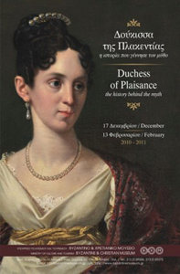 Δούκισσα της Πλακεντίας: Μια ζωή γεμάτη μυστήρια και μύθους Πόσοι άραγε γνωρίζουν το πραγματικό όνομα της Δούκισσας της Πλακεντίας (Sophie Barbé de Marbois, Duchesse de Plaisance (1785-1854)); Οι Αθηναίοι στα μέσα του 19ου αιώνα την ονόμαζαν Δουκέσσα της Πιατσέντσας, την αντιμετώπιζαν με φόβο και δέος και ύφαναν γύρω από τη ζωή της ένα πυκνό πλέγμα μύθων. Αυτό το πλέγμα προσπαθεί να διαπεράσει η έκθεση του Βυζαντινού και Χριστιανικού Μουσείου και να αναδείξει κάποιες από τις άγνωστες πτυχές της προσωπικότητας και της δράσης της Δούκισσας της Πλακεντίας στην Ελλάδα. Ομορφη, έξυπνη και εκκεντρική. Δυναμική, αλλά και παραιτημένη από τη ζωή. Φειδωλή, ιδιότροπη και σαφώς πολύ πλού