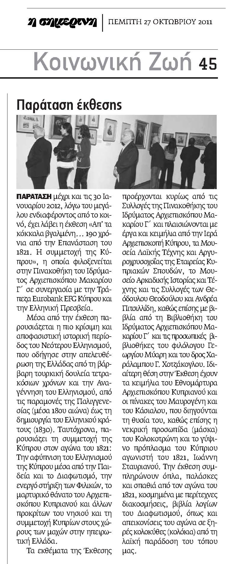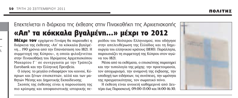 Μ ακαρίου Γ΄ σε συνεργασία με την Τράπεζα Eurobank και την Ελληνική Πρεσβεία από 29 Μαρτίου 2011 έως 30 Σεπτεμβρίου 2011, λόγω του μεγάλου ενδιαφέροντος από το κοινό (Κύπριους και ξένους επισκέπτες), αλλά και των μαθητών Μέσης και Δημοτικής εκπαίδευσης, παρατείνεται έως τις 30 Ιανουαρίου 2012.