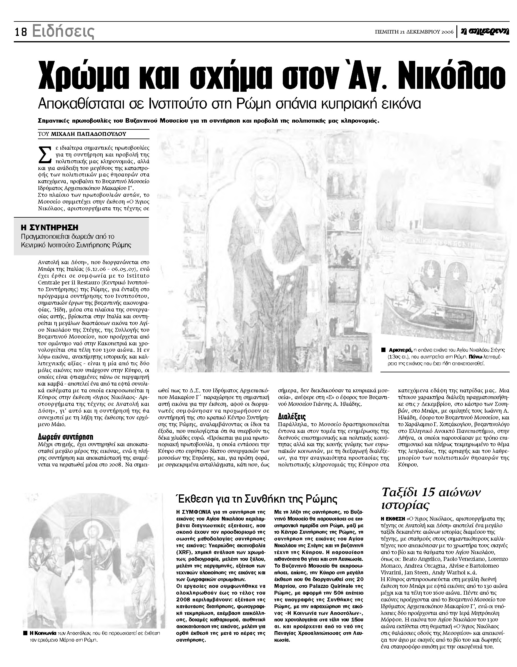 Σε ιδιαίτερα σημαντικές πρωτοβουλίες για τη συντήρηση και προβολή της πολιτιστικής μας κληρονομιάς, αλλά και για ανάδειξη του μεγέθους της καταστροφής των πολιτιστικών μας θησαυρών στα κατεχόμενα, προβαίνει το Βυζαντινό Μουσείο Ιδρύματος Αρχιεπισκόπου Μακαρίου Γ’. Στο πλαίσιο των πρωτοβουλιών αυτών, το Μουσείο συμμετέχει στην έκθεση «O Άγιος Νικόλαος, αριστουργήματα της τέχνης σε Ανατολή και Δύση», που διοργανώνεται στο Μπάρι της Ιταλίας (6.12.06 - 06.05.07), ενώ έχει έρθει σε συμφωνία με το Istituto Centrale per il Restauro (Κεντρικό Ινστιτούτο Συντήρησης) της Ρώμης, για ένταξη στο πρόγραμμα συντήρησης του Ινστιτούτου,σημαντικών έργων της βυζαντινής εικονογραφίας. Ήδη, μέσα στα πλαίσια της συνεργασίας αυτής, βρίσκεται στην Ιταλία και συντηρείται η μεγάλων διαστάσεων εικόνα του Αγίου Νικολάου της Στέγης, της Συλλογής του Βυζαντινού Μουσείου, που προέρχεται από τον ομώνυμο ναό στην Κακοπετριά και χρονολογείται στα τέλη του 13ου αιώνα. Η εν λόγω εικόνα, ανεκτίμητης ιστορικής και καλλιτεχνικής αξίας είναι η μία από τις δύο μόλις εικόνες που υπάρχουν στην Κύπρο, οι οποίες είναι φτιαγμένες πάνω σε περγαμηνή και καμβά αποτελεί ένα από τα εφτά συνολικά εκθέματα με τα οποία εκπροσωπείται η Κύπρος στην έκθεση «Άγιος Νικόλαος- Αριστουργήματα της τέχνης σε Ανατολή και Δύση», γι’ αυτό και η συντήρησή της θα συνεχιστεί με τη λήξη της έκθεσης τον ερχόμενο Μάιο.