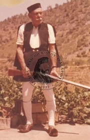 Title: Photo of the Cypriot Hadjiantonis Poularos from Morphou who fought during the Macedonian struggle. Hadjiantonis Poularos, who fought as a volunteer in the Macedonian Struggle, is shown in the photo at the age of 98 in uniform as a macedonian fighter |
