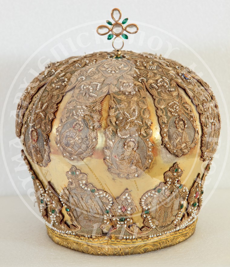 | Τεχνική: Ασήμι επιχρυσωμένο και χρυσοκέντητο ύφασμα με μαργαριτάρια | |