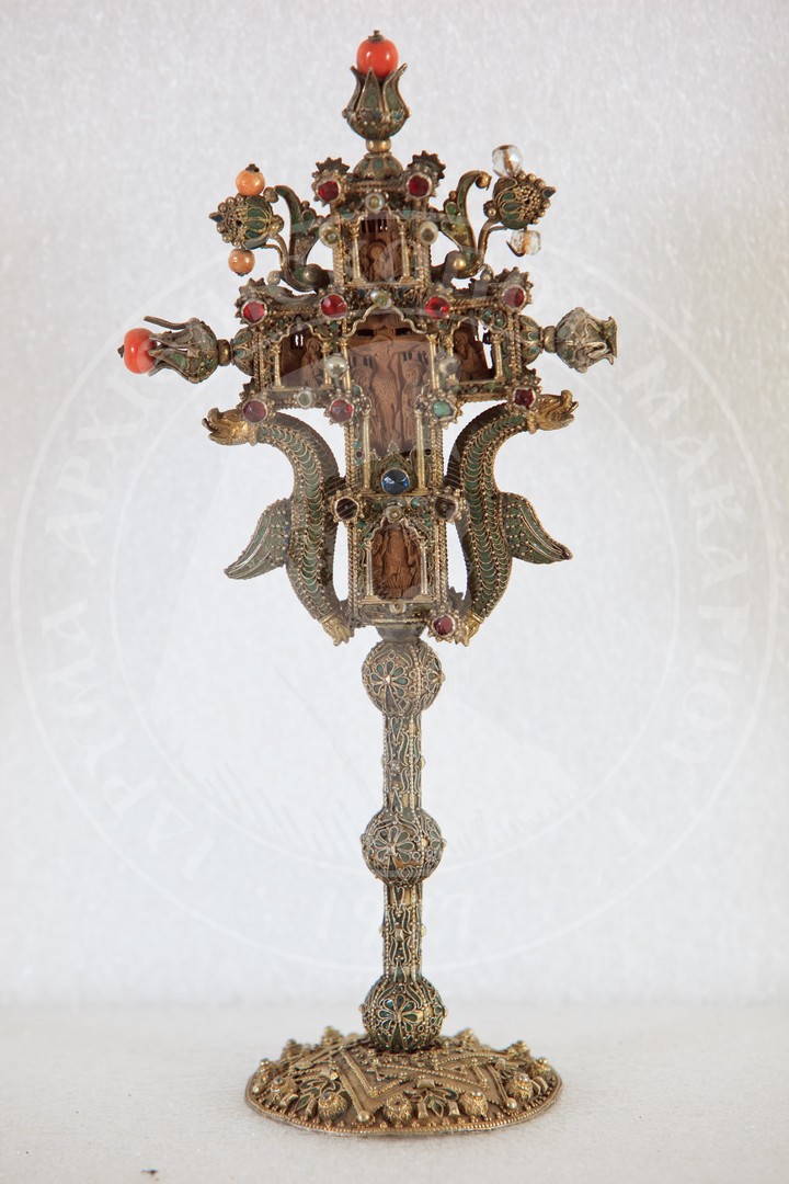 Title: Wooden carved Cross with silver-gold coating and enamel