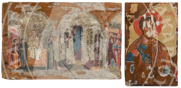 Title: Section of an epistyle depicting Lithos (the empty Tomb of Christ), the Meeting of the Risen Christ with the Myrrhbearing ladies, and the Doubting of Thomas. On the back: the Apostle Luke |