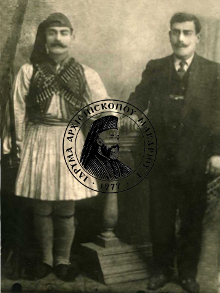 Βασίλης Χατζήμιχαηλ (αδελφός Κατερίνας) με στολή τσολιά μαζί με ένα φίλο του στη Σελεύκεια |