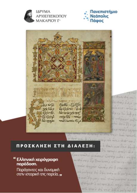Υπό την αιγίδα του Μακαριωτάτου Αρχιεπισκόπου Κύπρου κ. Χρυσοστόμου Β΄, το Ίδρυμα Αρχιεπισκόπου Μακαρίου Γ΄, και το Πανεπιστήμιο "Νεάπολις" Πάφου διοργανώνουν το Σάββατο, 11 Μαΐου 2019 και ώρα 19:00 διάλεξη με θέμα: «Η Ελληνική χειρόγραφη Παράδοση. Παράγοντες και δυναμική στην ιστορική της πορεία» και ομιλητή τον Επίκουρο Καθηγητή του Πανεπιστημίου "Νεάπολις" Πάφου πρωτ. Κωνσταντίνο Ε. Κωστάκη. H διάλεξη πραγματοποιείται στα πλαίσια της προώθησης του ειδικού Σεμιναρίου: «Στοιχεία Ελληνικής Παλαιογραφίας με ανάγνωση χειρογράφων», το οποίο από τον Σεπτέμβριο του Ακαδημαϊκού έτους 2019-2020, θα πραγματοποιείται και στη Λευκωσία από το "St Neophytos Lab" Εργαστήριο Εκκλησιαστικής Ιστορίας, Παλαιογραφίας και Ελληνορθόδοξου Πολιτισμού του Πανεπιστημίου "Νεάπολις" Πάφου σε συνεργασία με το Ίδρυμα Αρχιεπισκόπου Μακαρίου Γ΄. Οι δραστηριότητες αυτές αποσκοπούν στη συνειδητοποίηση της περίοπτης θέσης που καταλαμβάνει η ελληνική χειρόγραφη παράδοση στο χώρο του παγκόσμιου πολιτισμού, αλλά και η ανεκτίμητη αξία της στο επίπεδο της υψηλής πνευματικής ποιότητας του Ελληνισμού. Η αποτυπωμένη στα ελληνικά χειρόγραφα προχριστιανική και χριστιανική ελληνική σκέψη, ενωμένη με τη διαχρονική και οικουμενική ελληνική γλώσσα και συμβολισμένη με την πανάρχαια ελληνική γραφή, διαθέτει μία μεγάλης εμβέλειας πνευματική και πολιτιστική δυναμική. Η δυναμική αυτή μπορεί να αξιοποιείται σήμερα, εφόσον συνεχίζει να μας ωθεί σε μια αδιάκοπη παιδευτική καλλιέργεια, να μας παρακινεί στην επιλογή της πορείας της αυθεντικής χρήσης και ερμηνείας των αρχειακών πηγών και να ενεργεί μέσα μας τη συνειδητοποίηση της τεράστιας πολιτιστικής και ζωντανής πνευματικής αξίας που η ίδια περικλείει.