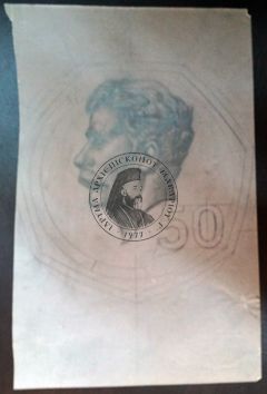 Title: Vassilis Michaelides with the outline of the 50 cents coin. Drawing for the artistic composition of the 50 cents coin that was never realized |